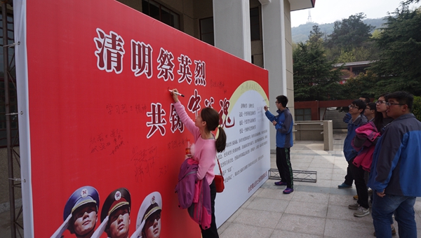大家對革命先烈的墓碑進行清掃,向革命英雄三鞠躬,并敬獻了花籃,青年們來到抗日戰(zhàn)爭宣傳展板前參觀,追思為國家興衰、民族存亡不惜拋頭顱、灑熱血的英雄,深切緬懷革命先烈。活動中,大家在“清明祭英烈,共鑄中華魂”宣傳牌前依次留言明志,誓將革命先烈大無畏的奉獻精神傳承下去,在自己的崗位上開花結(jié)果,讓青春無悔。