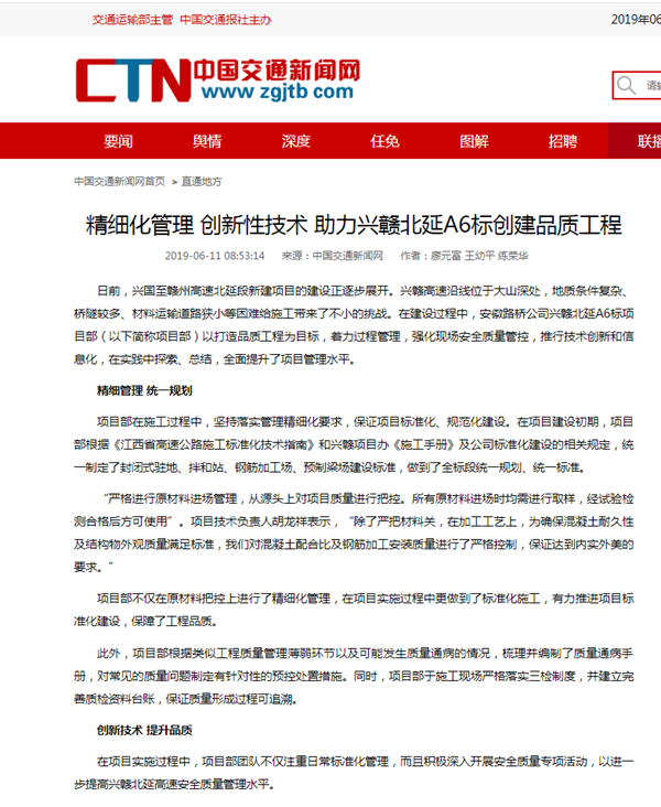 近日,中國(guó)交通新聞網(wǎng)以《精細(xì)化管理 創(chuàng)新性技術(shù) 助力興贛北延A6標(biāo)創(chuàng)建品質(zhì)工程》為題,對(duì)公司承建的江西興贛北延A6標(biāo)項(xiàng)目建設(shè)進(jìn)行了專(zhuān)題報(bào)道。
