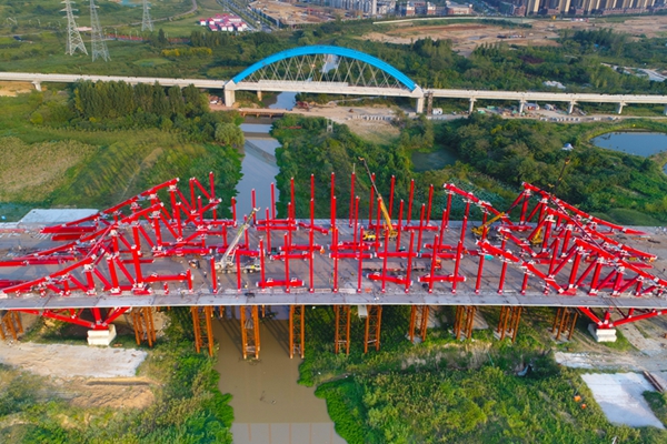 集賢路項(xiàng)目鋼桁拱橋橋面成功合龍