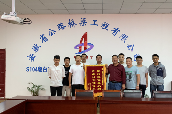 9月4日,寧國市交通運輸局副局長程紹忠一行為S104PPP項目送來感謝信和一面書寫著“抗臺救援顯大愛、危難時刻伸援手”的錦旗,對項目近期在支援地方抗洪搶險中所做的貢獻表示感謝。
