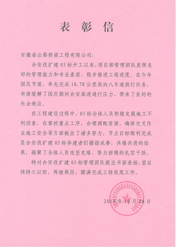 近日,合安高速改擴(kuò)建項(xiàng)目辦發(fā)來表彰信,對(duì)公司承建的第三標(biāo)段給予書面表揚(yáng)。