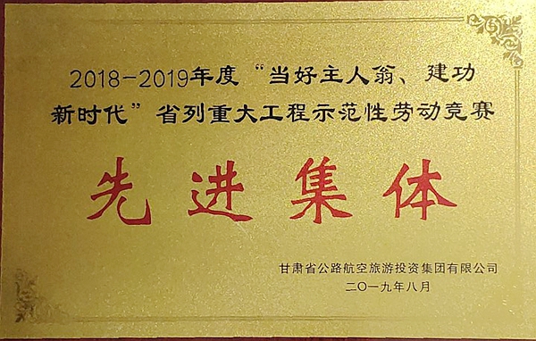 因在甘肅省公航旅集團(tuán)開展的2018-2019年度“當(dāng)好主人翁、建功新時代”省列重大工程示范性勞動競賽活動中表現(xiàn)優(yōu)異,11月17日,銀百高速TY14標(biāo)被授予“先進(jìn)集體”稱號,項目負(fù)責(zé)人同時榮獲“優(yōu)秀項目經(jīng)理”稱號。