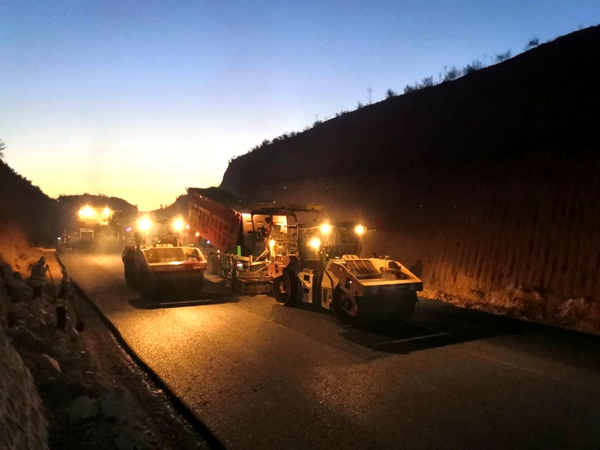 項(xiàng)目全長34.6公里,途徑四個鄉(xiāng)鎮(zhèn),在完成路基施工后,根據(jù)交驗(yàn)時間分段進(jìn)入路面攤鋪。立足實(shí)際情況,項(xiàng)目充分發(fā)揮主觀能動性,尋找一切可利用的工作面,精心策劃、見縫插針組織路面施工。在率先完成一工區(qū)水穩(wěn)、瀝青攤鋪施工任務(wù)后,迅速組織精干力量,轉(zhuǎn)戰(zhàn)一二工區(qū)連接部分?jǐn)備伿┕?,僅用20余天打通了兩個工區(qū)的運(yùn)輸通道。