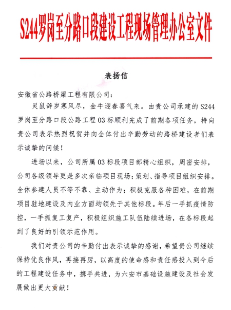 近日,六安市S244羅崗至分路口段建設(shè)工程現(xiàn)場辦發(fā)來表揚信,對公司承建的03標(biāo)項目順利完成前期各項任務(wù)給予高度認(rèn)可并通報表揚。