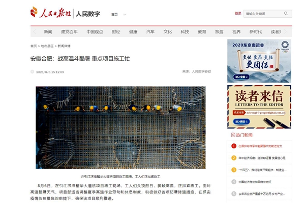 8月6日,《人民日報》數(shù)字安徽以《安徽合肥:戰(zhàn)高溫斗酷暑 重點項目施工忙》為題報道了公司承建的引江濟淮繁華大道橋項目建設(shè)情況。