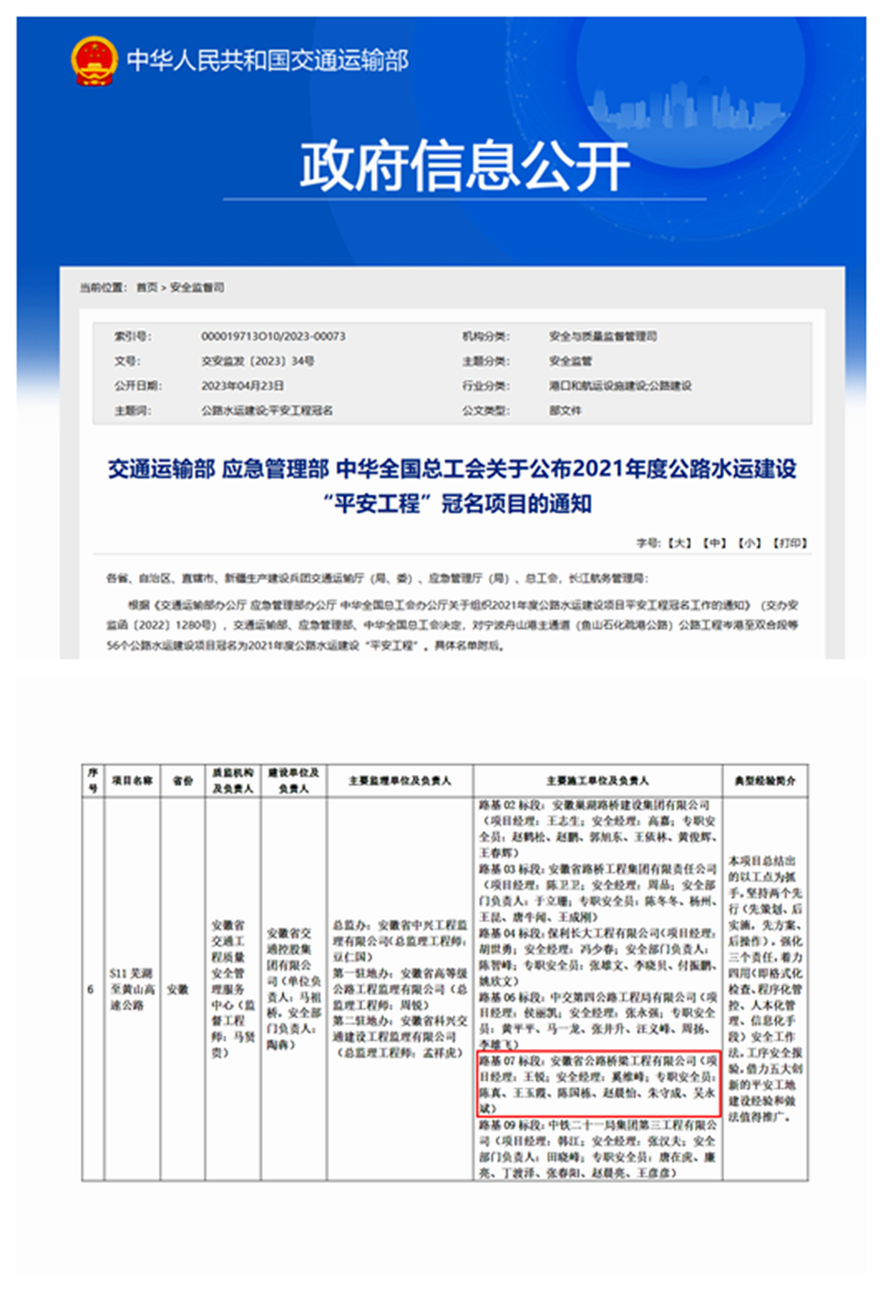 4月23日,交通運輸部、應(yīng)急管理部、中華全國總工會公布了2021年度公路水運建設(shè)“平安工程”冠名項目名單,公司參建的蕪黃高速項目榮獲2021年度全國公路水運建設(shè)“平安工程”冠名,在全國40個獲獎公路項目中排名第6,被作為10個經(jīng)驗典型項目之一全國推廣,也是安徽省唯一獲得該獎項的公路工程項目。