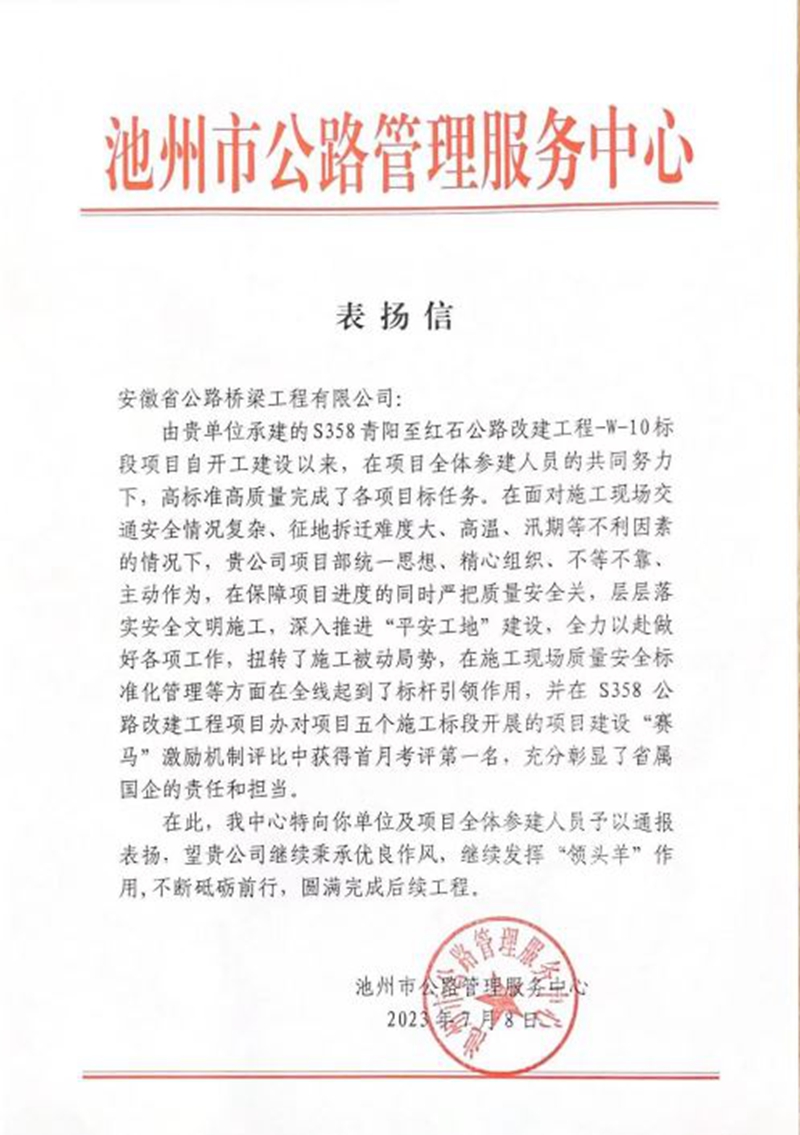 來信指出,公司承建的S358青陽至紅石公路改建工程W10標(biāo)項目開工建設(shè)以來,面對現(xiàn)場交通安全情況復(fù)雜、征遷難度大、高溫、汛期等不利因素,不等不靠、主動作為,在保障進度的同時,推進“平安工地”建設(shè),迅速扭轉(zhuǎn)被動局勢,在質(zhì)量安全標(biāo)準(zhǔn)化管理等方面全線起到標(biāo)桿引領(lǐng)作用,榮獲S358公路改建工程項目建設(shè)“賽馬”激勵機制首月考評第一名,彰顯了省屬國有企業(yè)的責(zé)任與擔(dān)當(dāng)。
