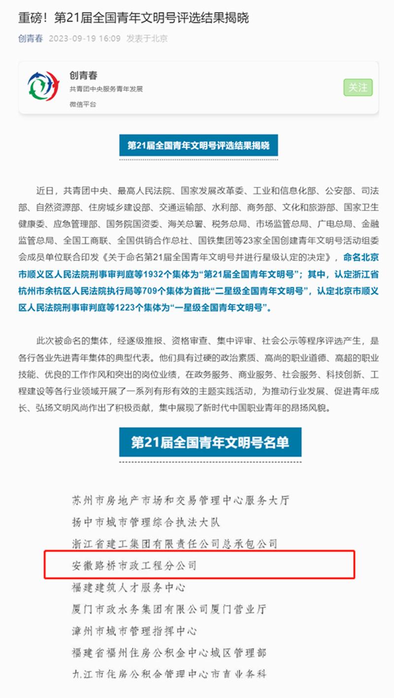 再添“國字號”榮譽(yù)!安徽路橋市政分公司榮獲“第21屆全國青年文明號”