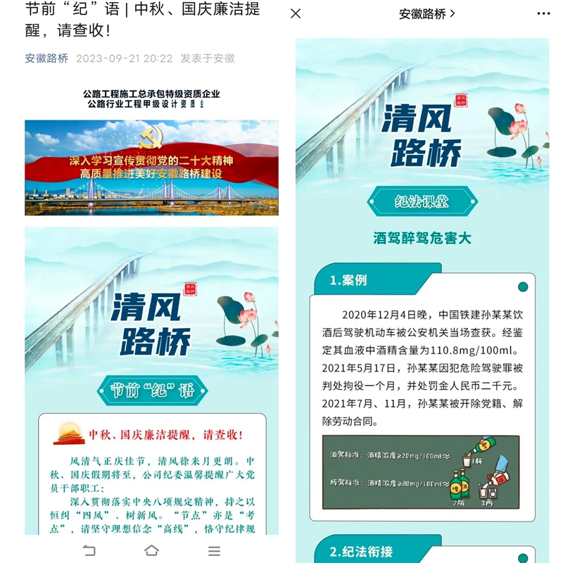 9月,公司陸續(xù)推出《紀(jì)法課堂|酒駕醉駕危害大》、《節(jié)前“紀(jì)”語|中秋、國慶廉潔提醒》,并組織學(xué)習(xí)中紀(jì)委、省紀(jì)委近期公開曝光的違反中央八項(xiàng)規(guī)定精神問題典型案例,向全體黨員干部發(fā)送廉潔過節(jié)提醒短信。中秋、國慶前,公司紀(jì)委通過微信公眾號(hào)、手機(jī)短信等形式密集推送廉潔提醒信息,重申節(jié)日紀(jì)律要求,做實(shí)作風(fēng)建設(shè)思想和紀(jì)律教育,早打招呼、早提醒。引導(dǎo)帶動(dòng)各級(jí)黨組織通過“三會(huì)一課”、主題黨日等,把全面從嚴(yán)治黨、加強(qiáng)節(jié)點(diǎn)作風(fēng)建設(shè)要求傳達(dá)到每一名黨員干部。市政分公司組織赴包公故里文化園開展“筑防線葆廉潔本色 揚(yáng)正氣創(chuàng)清風(fēng)路橋”主題黨日活動(dòng);橋梁分公司、軌道分公司逐級(jí)對(duì)關(guān)鍵崗位人員開展廉潔從業(yè)談心談話,持續(xù)提高黨員干部紀(jì)律規(guī)矩意識(shí)。時(shí)刻繃緊紀(jì)律規(guī)矩之弦,對(duì)標(biāo)作風(fēng)建設(shè)紀(jì)律規(guī)矩檢視律己,守紀(jì)律、知敬畏、過“廉”節(jié)。