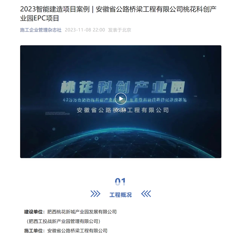 近日,從施工企業(yè)管理雜志社傳來喜訊,桃花科創(chuàng)產(chǎn)業(yè)園項(xiàng)目入選施工企業(yè)管理雜志社2023智能建造項(xiàng)目案例,同步對(duì)案例進(jìn)行了專題介紹。