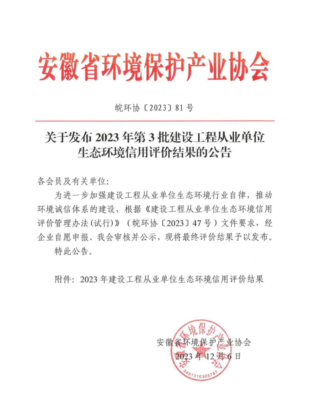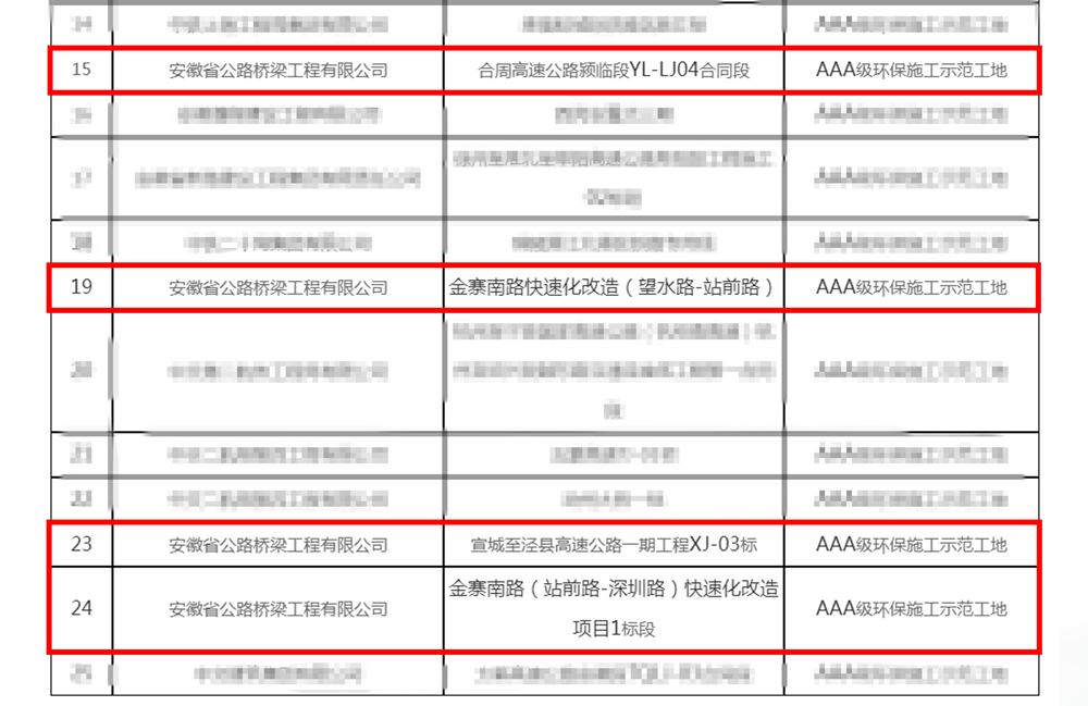 12月6日,安徽省環(huán)境保護產(chǎn)業(yè)協(xié)會公布了“2023年建設工程從業(yè)單位生態(tài)環(huán)境信用評價結果”,公司承建的合周高速潁臨段YL-LJ04標項目、金寨南路快速化改造(望水路-站前路)、宣城至涇縣高速公路一期工程XJ-03標、金寨南路(站前路-深圳路)快速化改造項目1標段四個項目榮獲安徽省“AAA級環(huán)保施工示范工地”稱號。