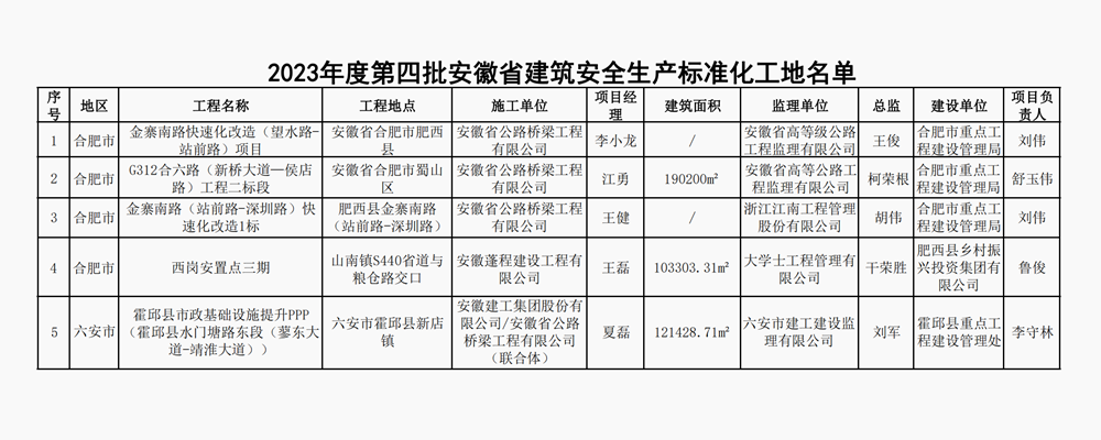 近日,安徽省建設工程質(zhì)量與安全協(xié)會公布2023年度第四批安徽省建筑安全生產(chǎn)標準化工地名單,由公司承建的金寨南路快速化改造(望水路-站前路)項目、G312合六路(新橋大道-侯店路)工程二標段、金寨南路(站前路-深圳路)快速化改造1標、霍邱縣市政基礎設施提升PPP(霍邱縣水門塘路東段(蓼東大道-靖淮大道))、肥西文旅西崗安置點三期等5個項目光榮上榜。