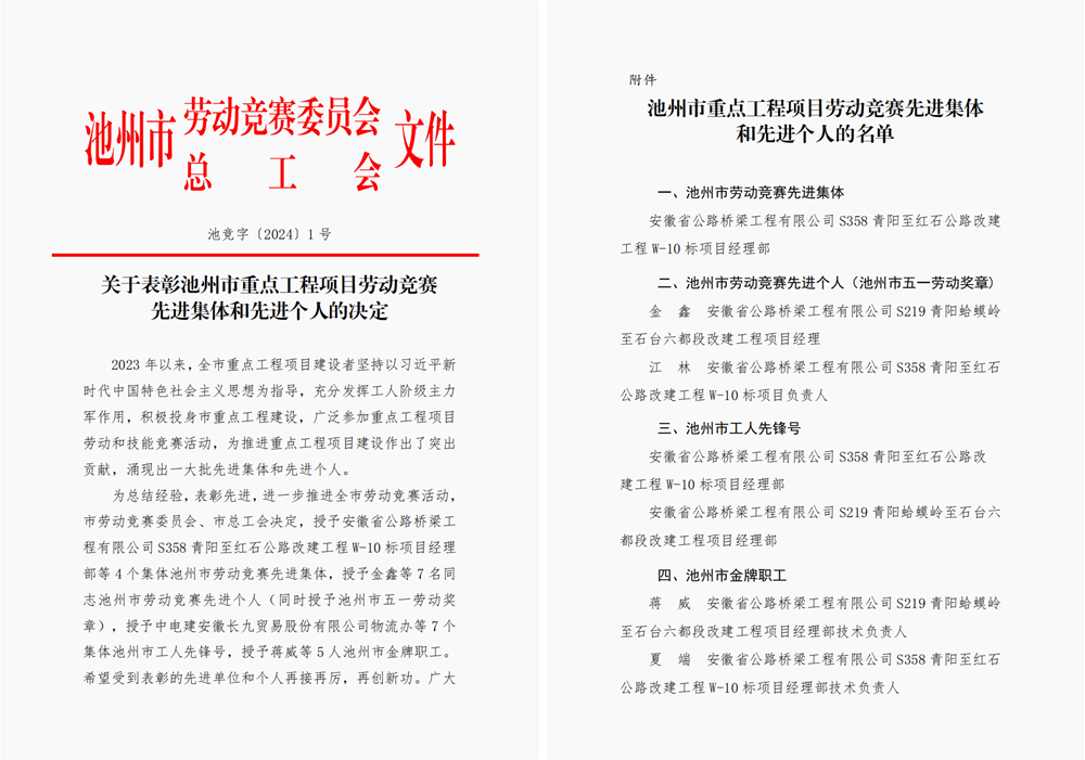 近日,池州市勞動競賽委員會、市總工會印發(fā)《關(guān)于表彰池州市重點工程項目勞動競賽先進(jìn)集體和先進(jìn)個人的決定》,公司所屬S358青陽至紅石公路改建工程W10標(biāo)項目經(jīng)理部獲評“市勞動競賽先進(jìn)集體”,金鑫、江林兩名同志獲評“市勞動競賽先進(jìn)個人”,同時授予池州市五一勞動獎?wù)拢籗358改建W10標(biāo)、S219青陽改建兩個項目獲評“市工人先鋒號”,蔣威、夏端兩名同志獲評池州市“金牌職工”。