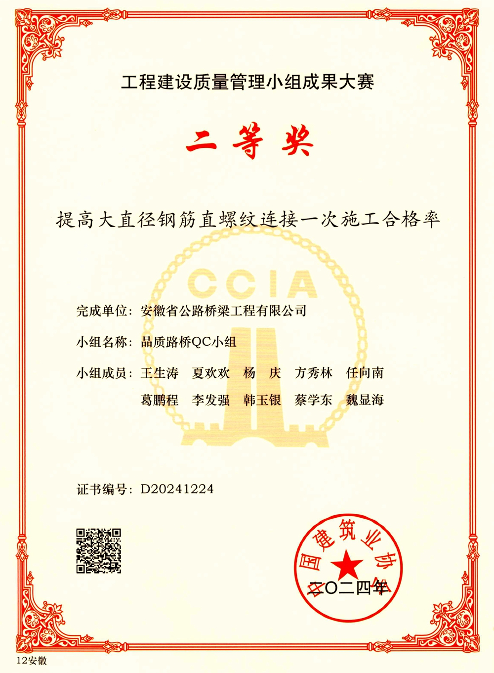 本次QC決賽共發(fā)布751項(xiàng)成果。公司推薦的《提高索導(dǎo)管定位安裝一次性驗(yàn)收合格率》《提高現(xiàn)澆箱梁波紋管準(zhǔn)確安裝一次性驗(yàn)收合格率》2項(xiàng)QC成果獲一等獎(jiǎng),《提高大直徑鋼筋直螺紋連接一次施工合格率》Q(chēng)C成果獲得二等獎(jiǎng)。