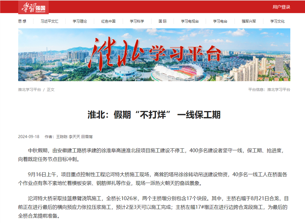 中秋假期,安徽建工路橋建設(shè)者堅(jiān)守崗位一線,搶抓施工“黃金期”,沖刺節(jié)點(diǎn)目標(biāo),跑出實(shí)干“加速度”,受到多家主流媒體聚焦報(bào)道。
