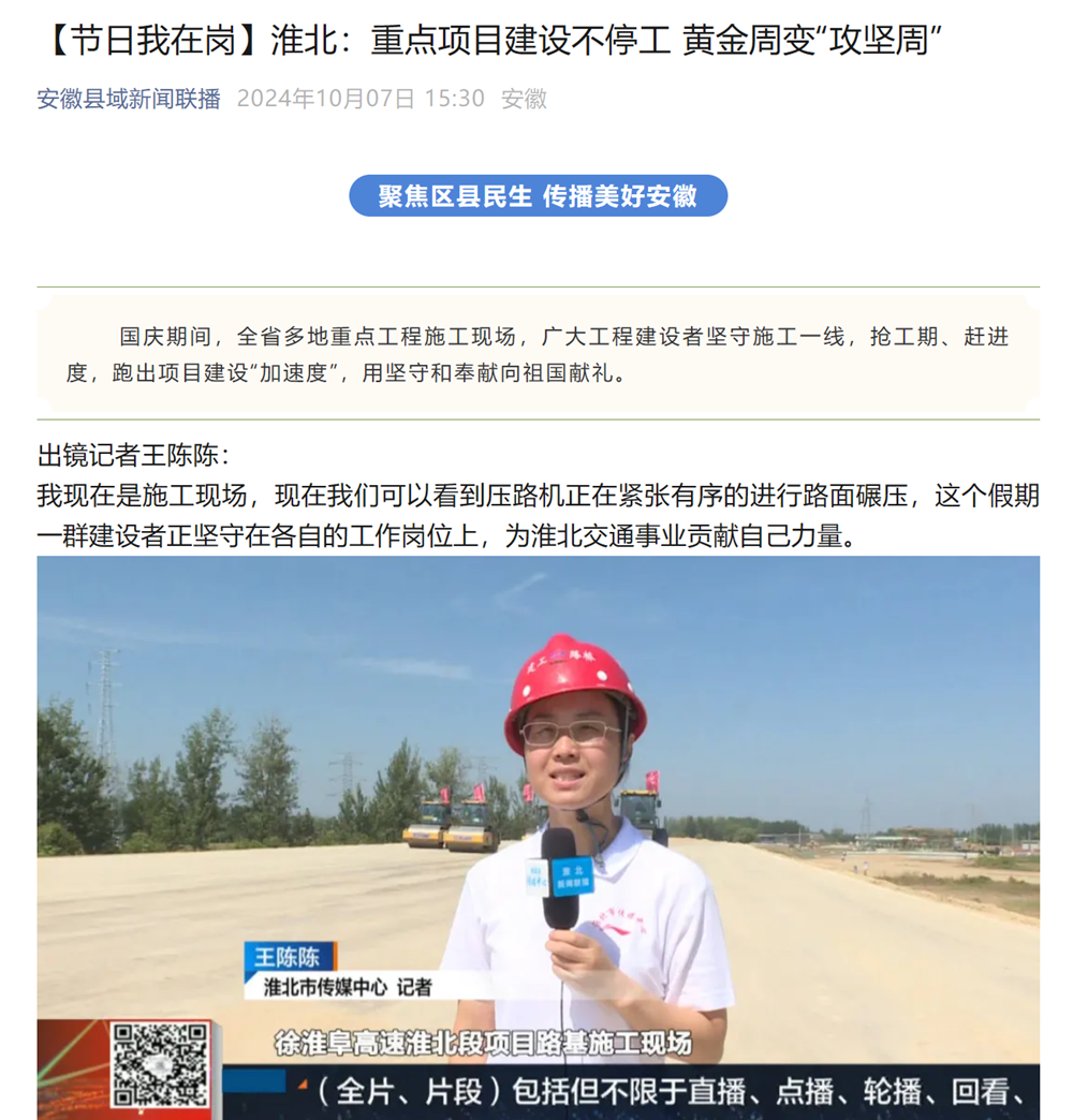 國慶前后,安徽新聞聯(lián)播、安徽日報(bào)、江淮晨報(bào)等多家省級主流媒體紛紛聚焦公司承建的涇青高速04標(biāo)、徐淮阜高速淮北段、合肥新橋國際機(jī)場綜合交通中心等重點(diǎn)項(xiàng)目建設(shè)情況進(jìn)行報(bào)道。