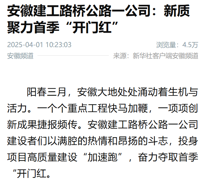【央媒聚焦】新華社客戶端:安徽建工路橋公路一公司——新質(zhì)聚力首季“開(kāi)門(mén)紅”