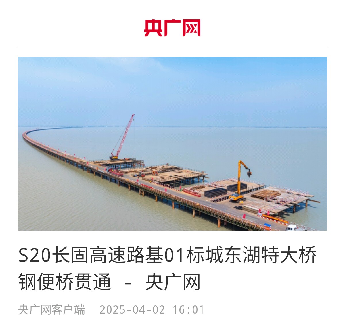 【央媒聚焦】央廣網(wǎng)等主流媒體關(guān)注報(bào)道S20長固高速路基01標(biāo)城東湖特大橋鋼便橋貫通