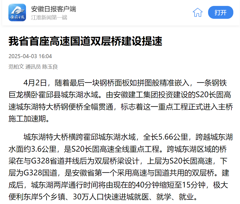 4月2日,隨著最后一塊鋼橋面板精準(zhǔn)嵌入,由安徽建工集團(tuán)投資建設(shè)的S20長固高速路基01標(biāo)段迎來重大節(jié)點(diǎn)——城東湖特大橋鋼便橋?qū)崿F(xiàn)全幅貫通,為主橋施工打通了"任督二脈"。