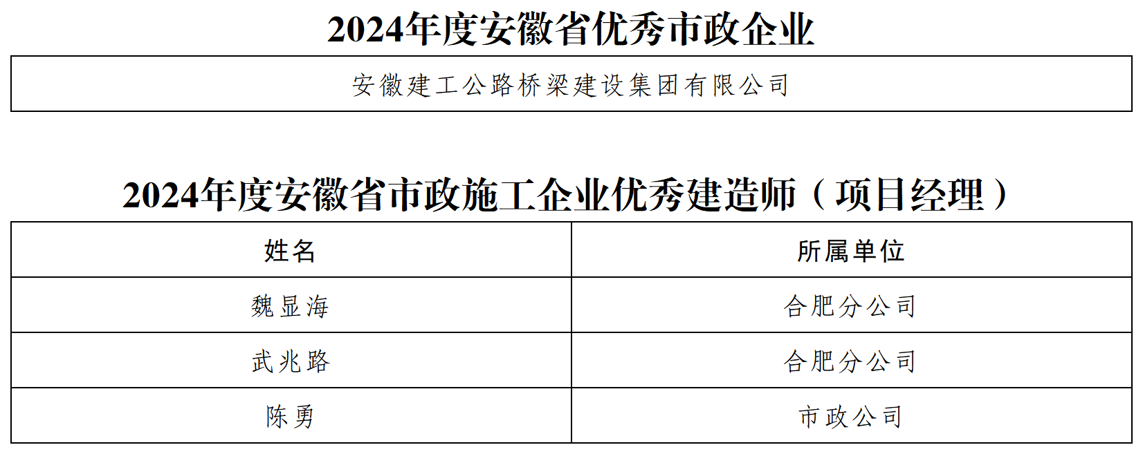 近日,從安徽省市政工程協(xié)會傳來喜訊,公司榮獲“2024年度安徽省優(yōu)秀市政施工企業(yè)”稱號,魏顯海、武兆路、陳勇被評為“優(yōu)秀建造師”。