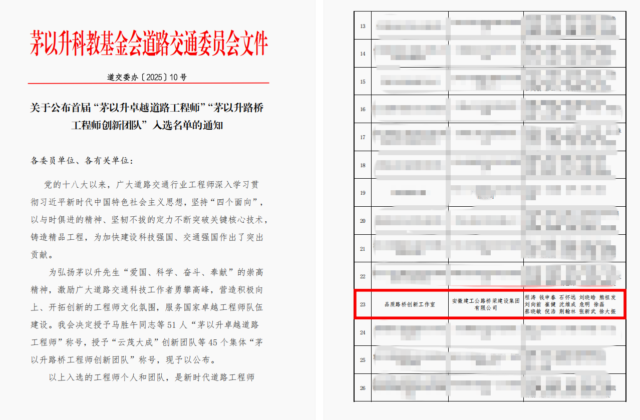 近日,茅以升科技教育基金會道路交通委員會公布首屆“茅以升路橋工程師創(chuàng)新團隊”評選結(jié)果,公司“品質(zhì)路橋創(chuàng)新工作室”憑借扎實的技術(shù)攻關(guān)能力與突出的工程實踐成果成功入選。