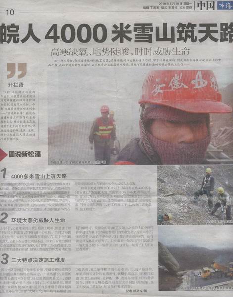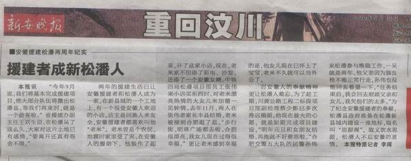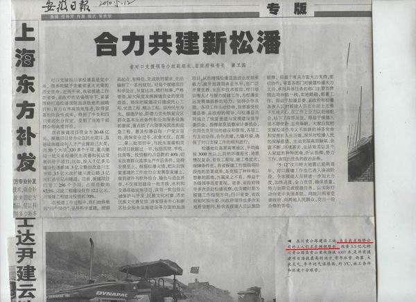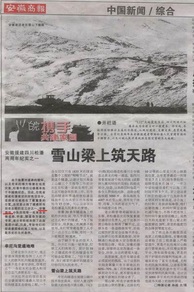 在“5.12”汶川大地震發(fā)生兩周年之際,安徽省路橋公司承建的我省對口援建四川松潘縣項(xiàng)目之一——漳黃公路道路改建工程02標(biāo)再次引起省內(nèi)各大主流媒體的高度關(guān)注。