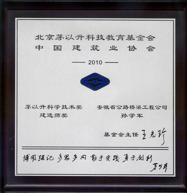 孫學軍主持建設了安徽省南照淮河大橋、沿江高速、廬銅高速、銅湯高速、合肥市徽州大道等工程項目,所建項目榮獲了國家優(yōu)質獎“魯班獎”、省優(yōu)“黃山杯”等獎項,并獲省交通廳“優(yōu)秀施工單位”、合肥市委市政府“大建設先進集體”等榮譽。此外,他個人榮獲全國優(yōu)秀建造師、“魯班獎”工程優(yōu)秀項目經理、“黃山杯”工程優(yōu)秀項目經理等榮譽。