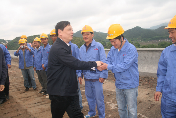 此次視察正值我標(biāo)實現(xiàn)單幅貫通之際。馬廳長一行經(jīng)全南互通區(qū)、聶徐桃江大橋、1#預(yù)制梁場,抵達(dá)我標(biāo)桃江大橋施工現(xiàn)場。一下車,馬廳長便在我標(biāo)項目經(jīng)理羅權(quán)引領(lǐng)下來到全體在建員工面前,親切地與大家一一握手,并說道:“安徽路橋的同志們辛苦了!”隨后,在聽取了羅權(quán)的簡短匯報后,馬廳長一行對目前我標(biāo)項目建設(shè)情況有了進一步的了解。針對年底建成通車的總體建設(shè)目標(biāo),馬廳長詳細(xì)詢問了后續(xù)的施工計劃,羅權(quán)表示,在各級領(lǐng)導(dǎo)的關(guān)心幫助下,安徽路橋有信心也有決心按期完成建設(shè)任務(wù)。