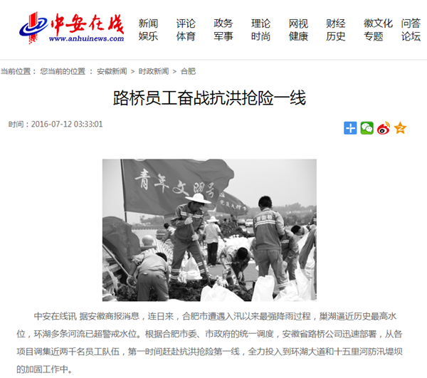 省級媒體聚焦公司抗洪搶險工作 發(fā)布時間:2016年07月13日 來源:黨委辦公室 發(fā)布人: 作者:王東 瀏覽:4074次 近日,公司積極響應合肥市委、市政府號召,全力參與環(huán)湖大道和十五里河抗洪搶險的事跡得到社會的高度關注。7月12日、13日,中安在線、《安徽商報》等多家省級媒體對公司抗洪搶險事跡進行了連續(xù)報道。
