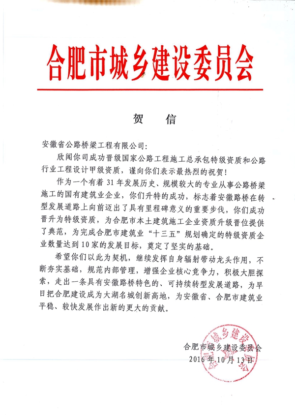 近日,合肥市城鄉(xiāng)建設(shè)委員會(huì)向公司發(fā)來賀信,熱烈祝賀公司晉升國(guó)家公路工程施工總承包特級(jí)資質(zhì)和公路行業(yè)工程設(shè)計(jì)甲級(jí)資質(zhì)。