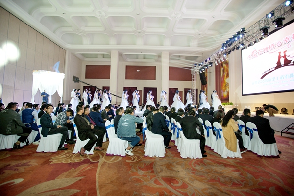 10點10分,一曲精妙絕倫的舞蹈《因為愛情》拉開了集體婚禮的帷幕。率先出場的是十二位帥氣的新郎,他們以一段酷炫的舞蹈表達了心中難以抑制的激動,將現(xiàn)場氣氛推向高潮。伴著優(yōu)美的樂曲,十二位美麗的新娘在眾人的注視下緩緩步入會場,來到新郎身邊。在浪漫的婚禮進行曲中新人們雙雙進入禮堂,在現(xiàn)場觀眾的見證下彼此交換信物。隨后,美麗的新娘們將手中的捧花拋給在場的單身男女們。