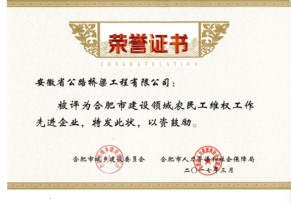公司榮獲“合肥市建設(shè)領(lǐng)域農(nóng)民工維權(quán)工作先進企業(yè)” 稱號 發(fā)布時間:2017年04月27日 來源:市政分公司 發(fā)布人: 作者:董丁祥 瀏覽:2790次 近日,合肥市城鄉(xiāng)建設(shè)委員會、人力資源和社會保障局表彰了在建設(shè)領(lǐng)域農(nóng)民工維權(quán)工作中表現(xiàn)突出的單位,公司榮獲“合肥市建設(shè)領(lǐng)域農(nóng)民工維權(quán)工作先進企業(yè)” 稱號。