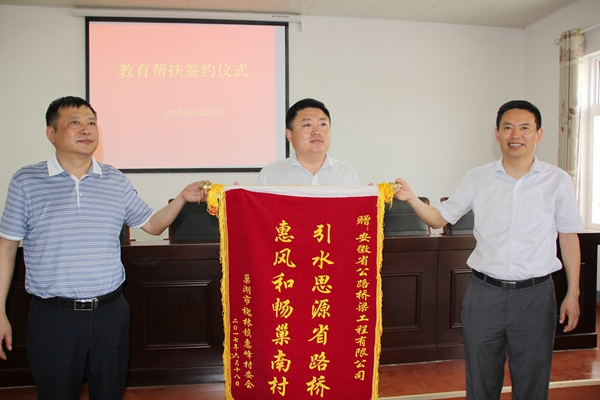 6月20日下午,在巢湖市槐林鎮(zhèn)惠峰村活動(dòng)中心,槐林鎮(zhèn)黨委主要負(fù)責(zé)人將一面錦旗贈(zèng)予安徽省公路橋梁工程有限公司,以感謝公司為當(dāng)?shù)胤鲐毠ぷ髯鞒龅呐拓暙I(xiàn)。公司黨委委員、副總經(jīng)理任杰代表公司接受了錦旗。