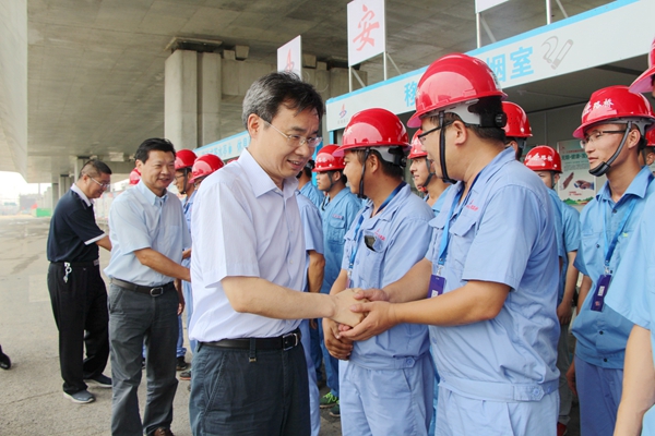 連日以來(lái),高溫酷暑籠罩著江淮大地,但廣大安徽路橋人依然堅(jiān)守施工一線,揮汗如雨。7月26日上午11時(shí),安徽省住建廳黨組書記、廳長(zhǎng)張?zhí)炫啵h組成員、副廳長(zhǎng)吳桂和,副巡視員劉少為一行在集團(tuán)工會(huì)主席徐曉光,公司董事長(zhǎng)、黨委書記、總經(jīng)理孫學(xué)軍等有關(guān)人員的陪同下,深入合肥阜陽(yáng)北路高架項(xiàng)目看望慰問(wèn)一線建設(shè)者,叮囑項(xiàng)目部做好防暑降溫工作,切實(shí)保障職工身心健康。