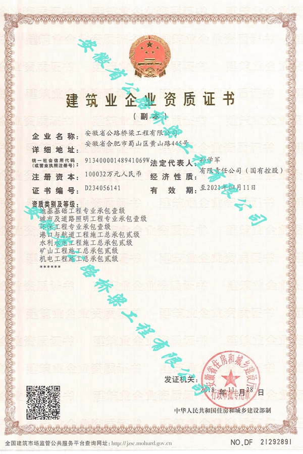 11月28日,公司地基基礎工程專業(yè)承包壹級、城市道路照明工程專業(yè)承包壹級、礦山工程施工總承包貳級三項資質順利通過安徽省住房和城鄉(xiāng)建設廳審查核準。
