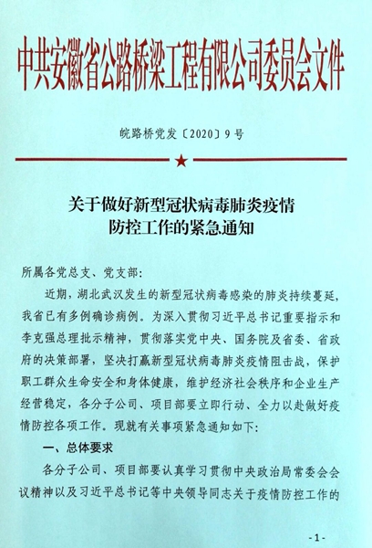 1月27日,公司黨委發(fā)布《關(guān)于做好新型冠狀病毒肺炎疫情防控工作的緊急通知》,對(duì)公司疫情防控工作進(jìn)行具體部署,要求各分子公司、項(xiàng)目部立即行動(dòng),全力以赴做好疫情防控工作。同步組織成立公司疫情防控工作領(lǐng)導(dǎo)小組,由主要負(fù)責(zé)人擔(dān)任組長(zhǎng),統(tǒng)籌負(fù)責(zé)公司疫情防控指揮、協(xié)調(diào)工作;同時(shí),所屬各生產(chǎn)單位也組織成立了疫情防控工作領(lǐng)導(dǎo)小組,全面加強(qiáng)對(duì)新型肺炎疫情防控工作的領(lǐng)導(dǎo)。實(shí)行領(lǐng)導(dǎo)班子成員輪流帶班制度,實(shí)時(shí)做好疫情防控指揮;建立疫情防控工作群,加強(qiáng)信息溝通和日常工作調(diào)度;各項(xiàng)目明確聯(lián)絡(luò)員,對(duì)疫情防控信息每日進(jìn)行報(bào)告。