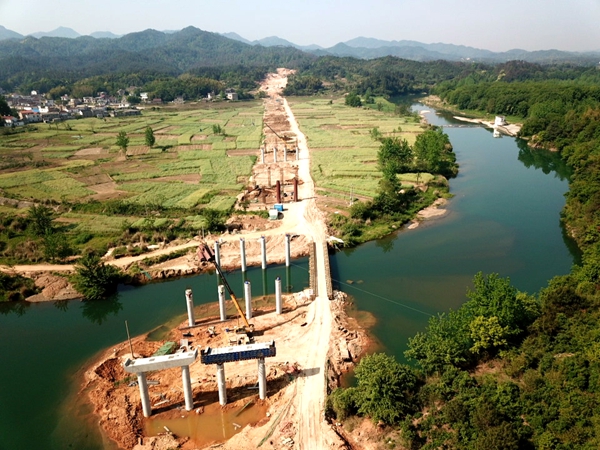 3月25日復興橋下部結構基礎完成,3月31日蓮花山隧道右線削竹式洞門施工完畢,4月4日梁場首片梁板完成澆筑,4月5日路基一隊與二隊清表完成、便道實現(xiàn)貫通,全線路基、隧道、橋梁工程多點發(fā)力,工程建設穩(wěn)步推進。期間,受降雨影響,白洋河橋圩區(qū)遭到破壞,項目黨支部迅速成立應急施工小組,全天駐點搶抓工期,目前白洋河水中墩已全部澆筑完畢,鋼便橋也已經(jīng)完成鋪設,如期完成既定任務,減輕了雨季到來前的施工壓力。