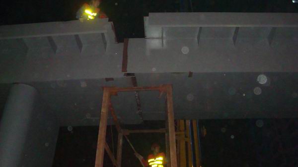 晚上21:30,運梁車準時將A梁運達施工區(qū),隨即北一環(huán)南側(cè)在交警的協(xié)助下,按計劃全封閉。經(jīng)過近一個多小時的安裝,晚上23:00整,張洼路天橋施工區(qū)響起了一陣陣掌聲,禮炮隨后騰空燃起——A梁成功安裝了。B梁在隨后的3個小時內(nèi)也成功完成安裝。