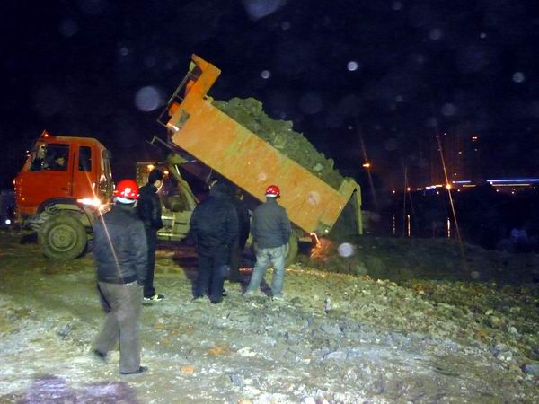 當12月19日,宋斗灣路完成第一根樁(位于南淝河北側(cè),屬于3#橋臺)的開挖澆注工作后,項目經(jīng)理部就開始籌劃南淝河南側(cè)的筑島圍堰工作。12月24日,當3#橋臺的六根樁全部澆注完成后,當天晚上仍繼續(xù)前一晚的筑島工作。每次筑島時,現(xiàn)場橋梁技術(shù)員、測量技術(shù)員和安全員都和工人們一起奮戰(zhàn),而每次奮戰(zhàn)都是一個通宵。截至25日,南淝河筑島圍堰共計用土近270車,約4600方,筑島面積和筑島深度達到預(yù)案和監(jiān)理要求,符合現(xiàn)場施工的實際要求。至此,筑島圍堰工作圓滿完成。