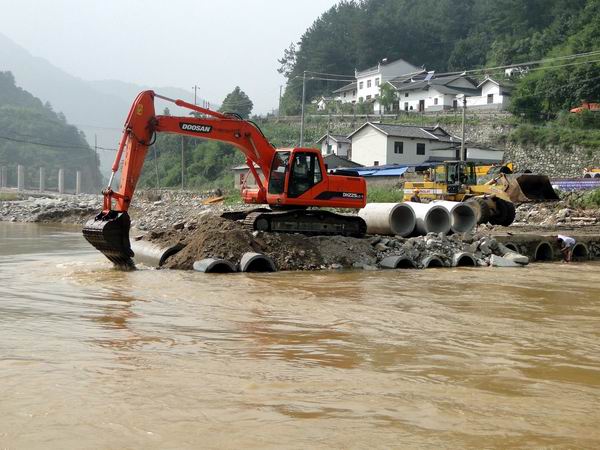 從27日開始,天氣放晴,水位下降,我部抓住機(jī)會進(jìn)行第三次搶修,一臺挖機(jī)、一臺裝載機(jī)和五臺運輸車同時作業(yè),終于在28日上午打通便橋。項目部迅速組織人員把施工設(shè)備、施工材料調(diào)運到對面,28日下午恢復(fù)小型結(jié)構(gòu)物施工。