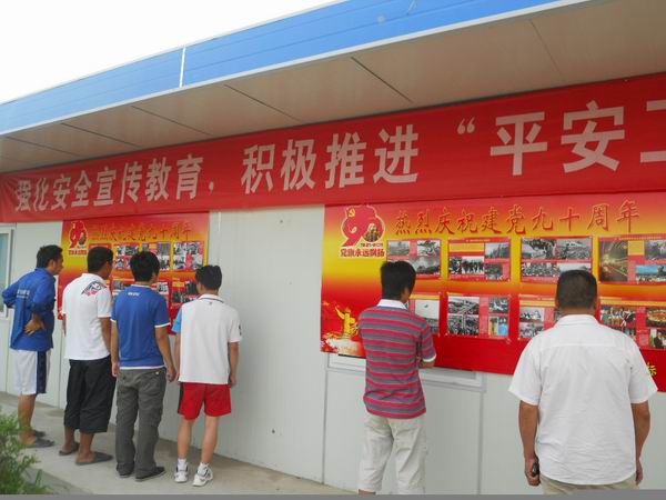 《黨旗永遠(yuǎn)飄揚》系列圖片展用大量翔實的資料照片生動地展現(xiàn)了中國共產(chǎn)黨90年來的輝煌成就。大家一邊觀看一邊激動地議論和感慨:“有了共產(chǎn)黨,才有了中國翻天覆地的變化,才有了中國繁榮富強的今天”。通過參觀,更加激發(fā)了員工們對中國共產(chǎn)黨的熱愛之情,堅定了大家的理想信念;激勵了項目一線員工更加積極的投入到蚌淮高速的施工建設(shè),為實現(xiàn)公司的“十二五”戰(zhàn)略規(guī)劃做出自己應(yīng)有的貢獻。晚上7點,在項目操場上,露天展映的抗日戰(zhàn)爭影片有紅色經(jīng)典影片《七七事變》、《狼牙山五壯士》、《地道戰(zhàn)》,讓大家又受了一次紅色精神的洗禮。