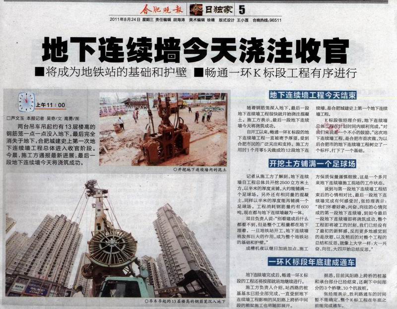 合肥晚報(bào)重點(diǎn)報(bào)道一環(huán)K標(biāo)地下連續(xù)墻施工 發(fā)布時(shí)間:2011年08月29日 來源: 發(fā)布人: 作者: 瀏覽:3124次