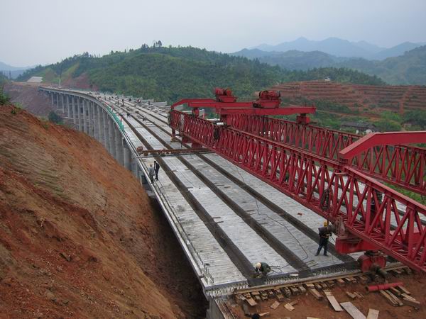 今年贛南雨季較之往年稍微提前,三月雨水繁多,給江口大橋的梁板安裝帶來(lái)了很大影響。作為開(kāi)年施工建設(shè)中的控制性施工點(diǎn),我部積極采取多種措施,在確保施工安全和工程質(zhì)量的前提下,大力推進(jìn)梁板安裝施工進(jìn)度。項(xiàng)目部成立以項(xiàng)目經(jīng)理為組長(zhǎng)的梁板安裝工作組,搶抓有利天氣開(kāi)展安裝工作,于2012年3月26日創(chuàng)造全線(xiàn)單天安裝10片30米T梁的記錄(包括架橋機(jī)過(guò)孔),扎扎實(shí)實(shí)的把工作落在實(shí)處,為我部完成江口大橋的半幅貫通奠定了堅(jiān)實(shí)基礎(chǔ)。