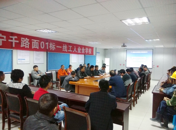 11月4日晚,寧千路面01標(biāo)會議室座無虛席,40余名農(nóng)民工兄弟再一次享受著該項(xiàng)目農(nóng)民工業(yè)余學(xué)校帶來的知識和樂趣。