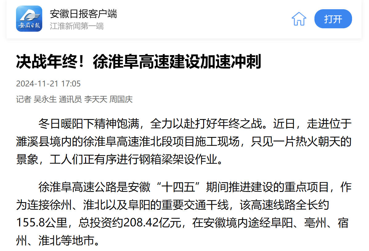 【名媒聚焦】安徽日?qǐng)?bào)客戶端、學(xué)習(xí)強(qiáng)國、淮北日?qǐng)?bào):決戰(zhàn)年終!徐淮阜高速建設(shè)加速?zèng)_刺