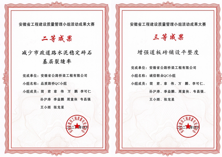 創(chuàng)新課題“積微成著”。憑借不同環(huán)境下的路基路面施工實(shí)踐,項(xiàng)目團(tuán)隊(duì)持續(xù)開展技術(shù)攻堅(jiān)和經(jīng)驗(yàn)萃取。在路面基層施工階段,通過嚴(yán)格控制石粉含泥量,成功避免水穩(wěn)碎石基層裂縫,基層壓實(shí)度全面控制在96%以上;在附屬結(jié)構(gòu)施工中,項(xiàng)目團(tuán)隊(duì)對(duì)人行道板磚使用及鋪設(shè)進(jìn)行改良,提升了路面觀感和行走舒適度。這些源于項(xiàng)目一線的創(chuàng)新案例,不僅提升了項(xiàng)目的建設(shè)質(zhì)量和效率,更為后續(xù)的項(xiàng)目建設(shè)提供了寶貴的經(jīng)驗(yàn)借鑒。相關(guān)QC成果在安徽省建設(shè)質(zhì)量管理小組成果大賽中分別獲得二等獎(jiǎng)和三等獎(jiǎng)。