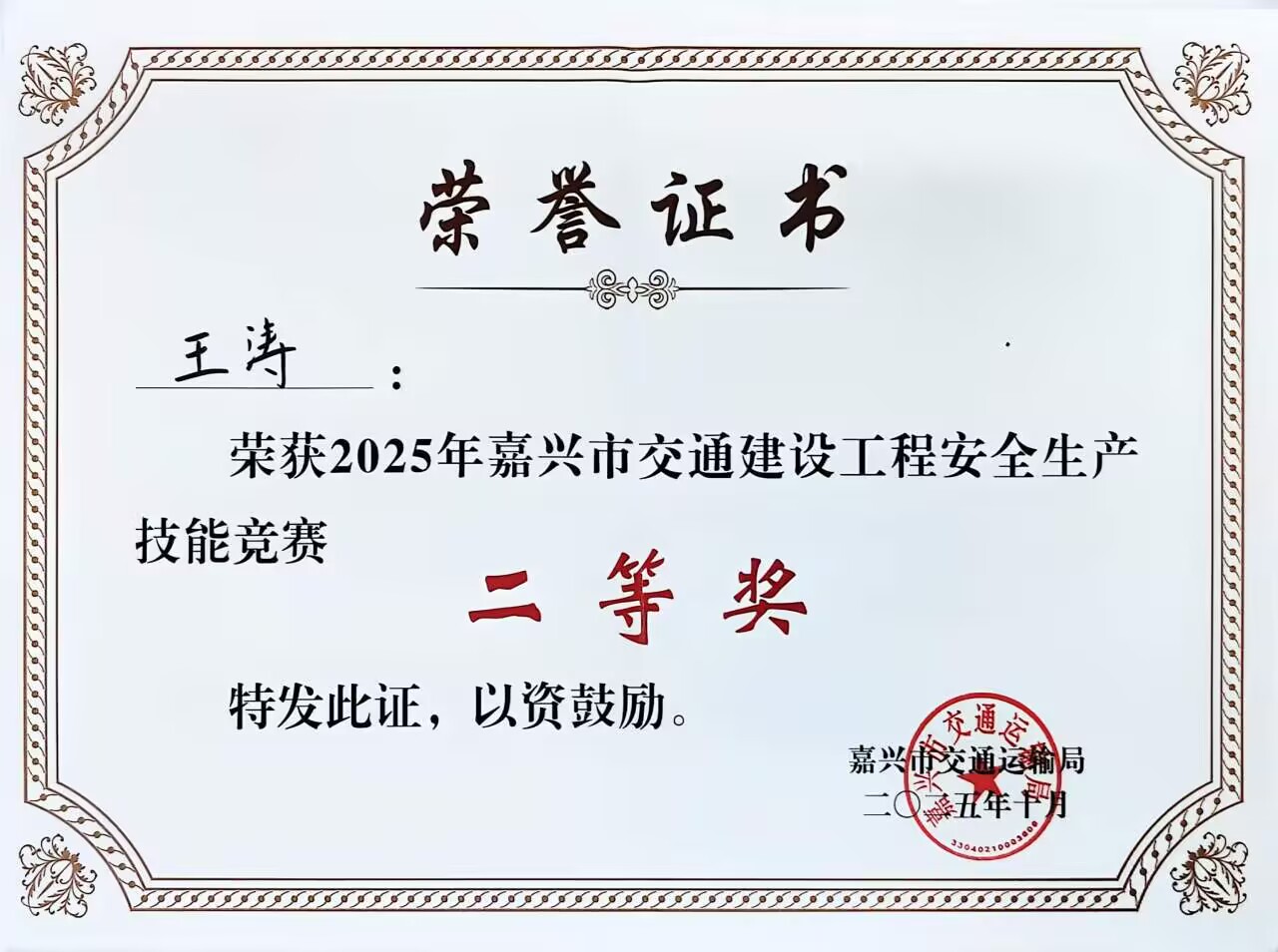 10月30日,由嘉興市總工會、嘉興市交通運輸局聯合舉辦的2025年嘉興市交通建設工程安全生產技能競賽,在浙江分公司524國道TJ01標項目圓滿舉行。項目精心選派的參賽選手王濤憑借出色發揮,榮獲二等獎。