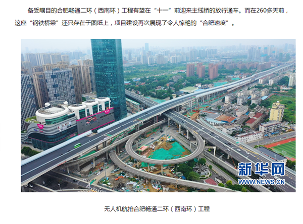 8月28日,國家級主流媒體再次聚焦公司承建的重點工程建設,《新華網》以《“飛閱”中國260天 見證“合肥速度”》為題,報道了公司承建的暢通南二環(西南環)項目建設進展情況。