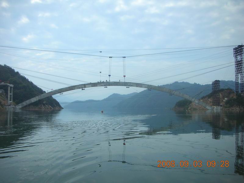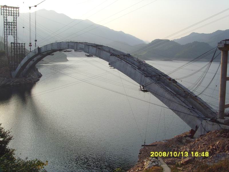 金桃大橋位于金寨縣,跨越梅山水庫。主橋采用二孔跨度均為160米的上承式鋼筋混凝土箱肋拱,引橋采用跨度13米的簡支空心板,橋梁全長491米。由于大橋跨越梅山水庫,箱拱、拱上立柱、系梁、蓋梁全部采用纜索吊裝,施工難度大。